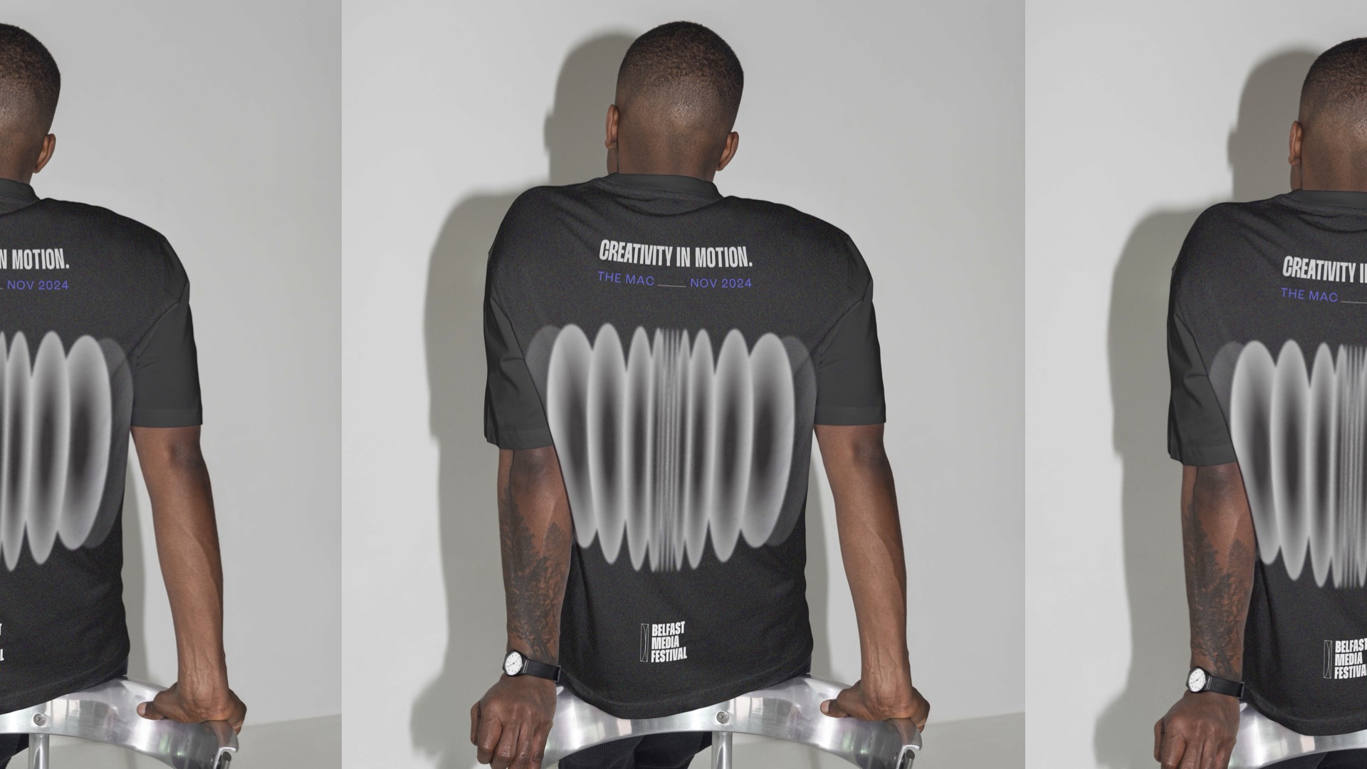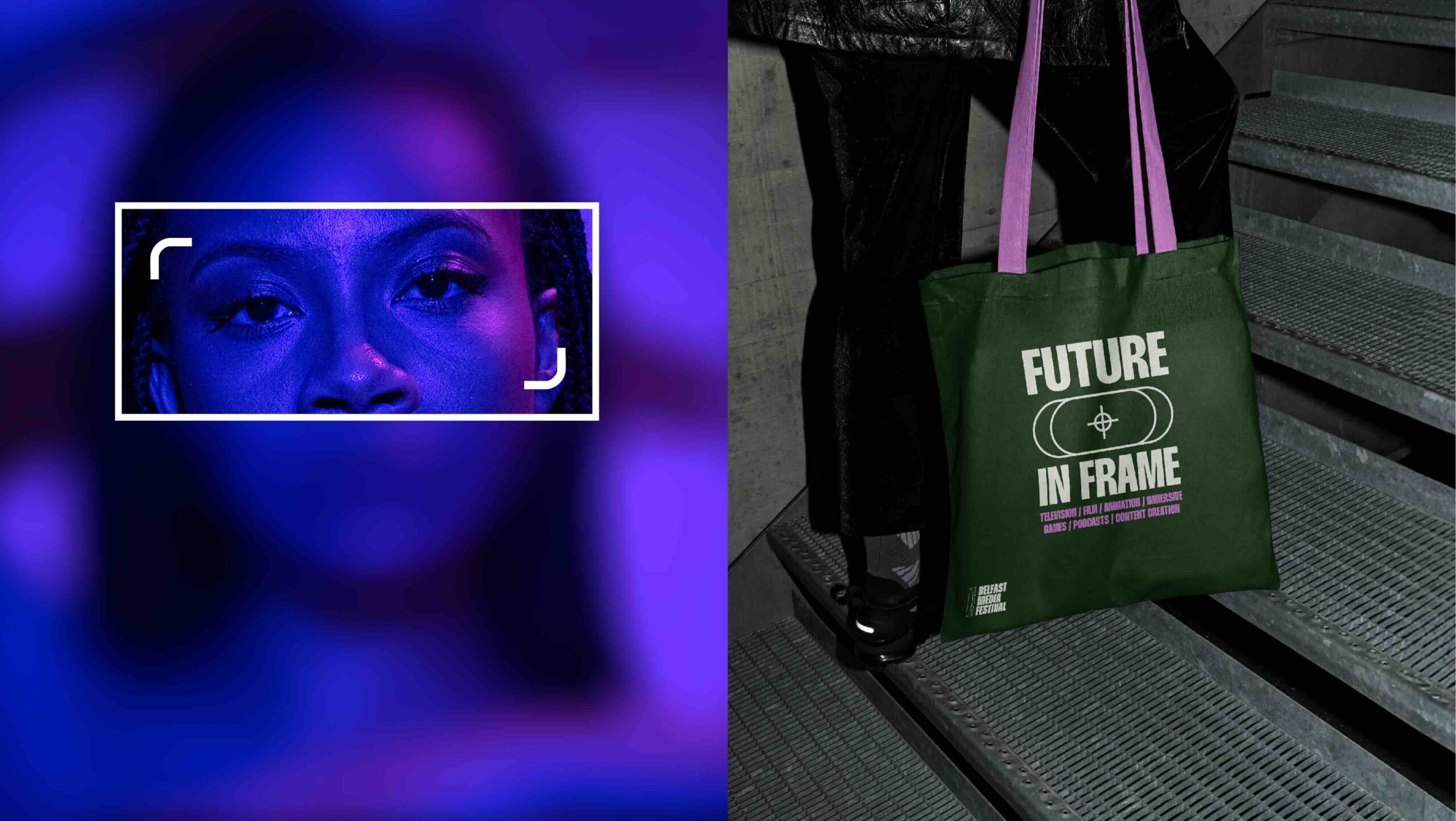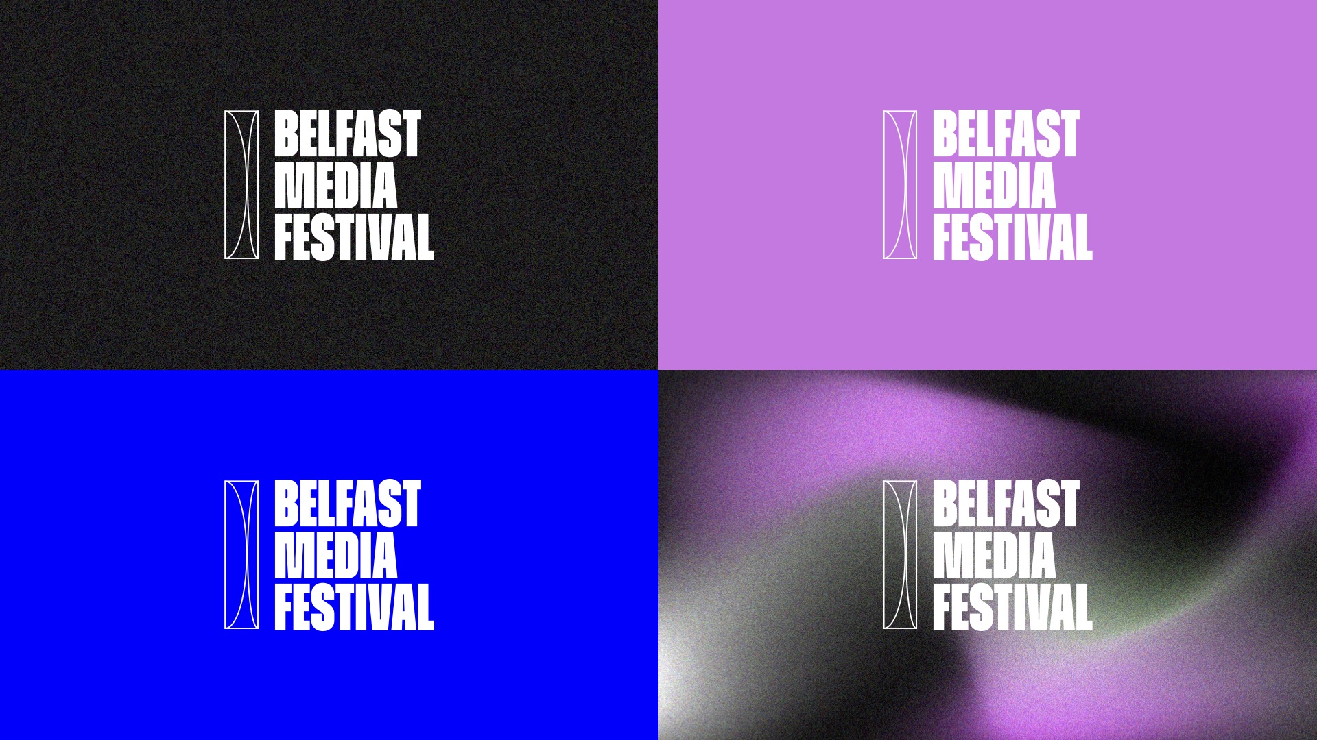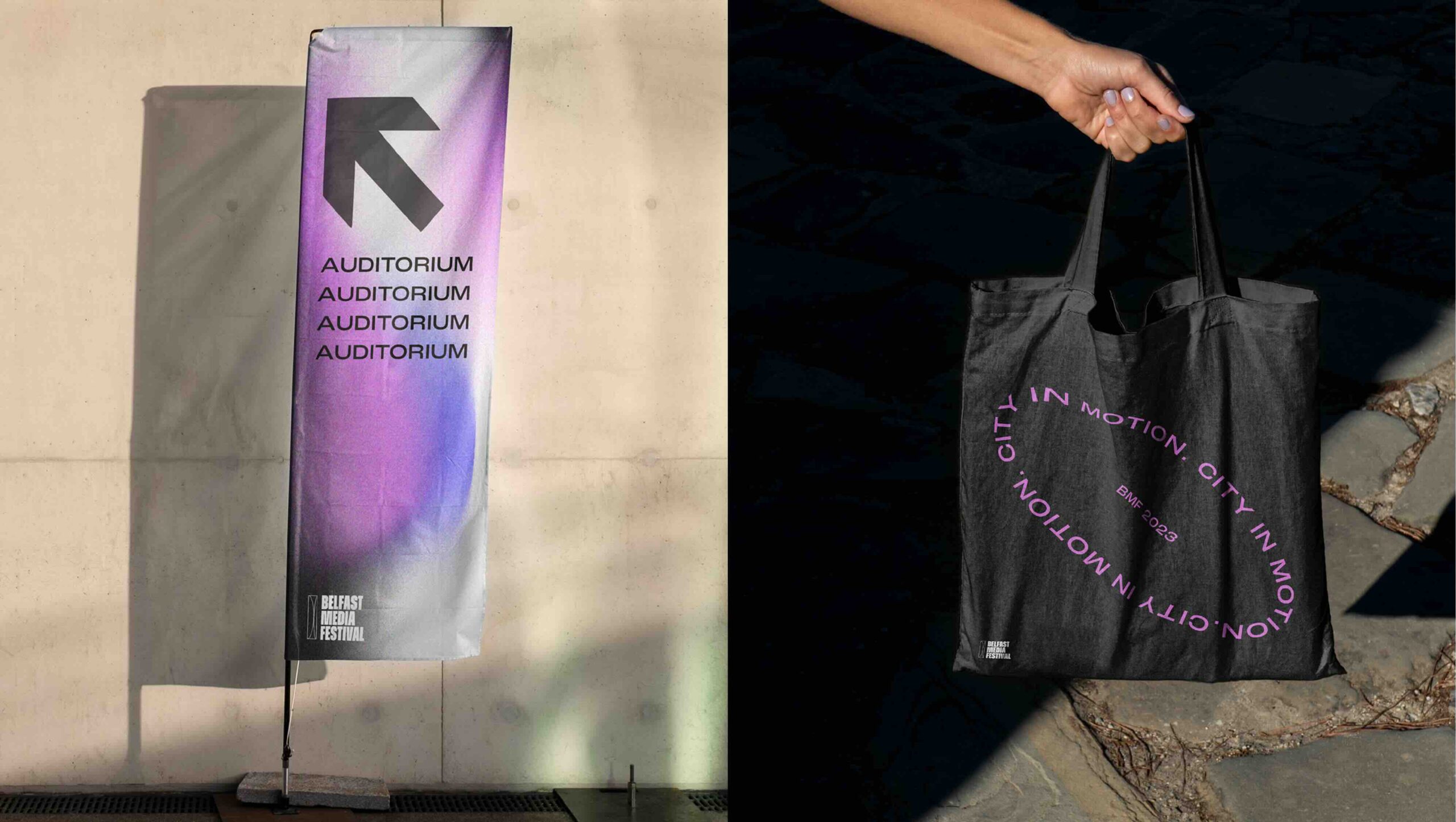 We devised a new, contemporary brand identity for the festival. This rebranding aimed to align the festival with its vibrant and youthful target audience. The brand was designed to be professional yet creative, inclusive, trendy, and fun. A dynamic brand campaign, “City in Motion,” was created to roll out the new brand identity. This campaign was implemented across various mediums, including merchandise, flyers, banners, and wayfinding, ensuring a cohesive and impactful presence. Visual elements were introduced that tied back to the festival’s core theme, incorporating a camera lens icon to symbolise the diverse media types represented at the Belfast Media Festival, including TV, film, gaming, and more. Gradient textures and fluid lines conveyed the dynamic nature of media, voices, and perspectives.The colour palette, built using RGB colours, prominently featured pink to appeal to a youthful audience.