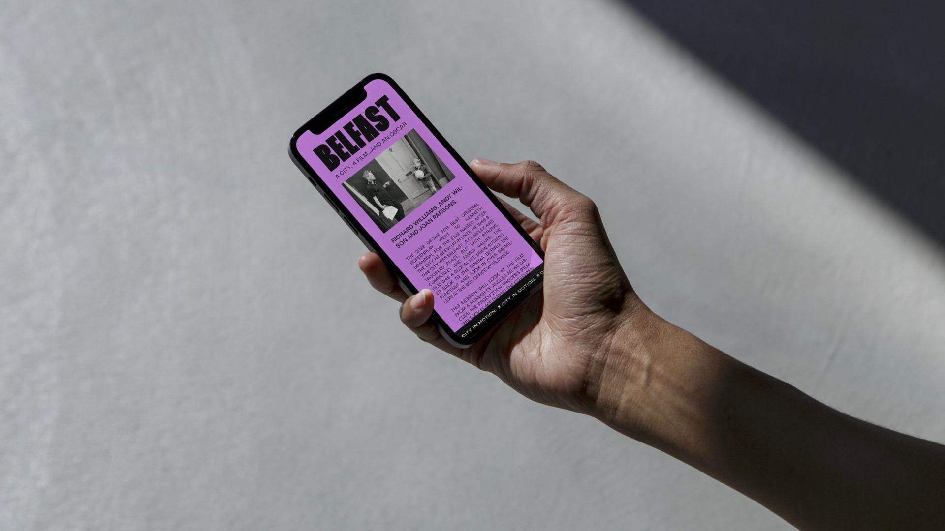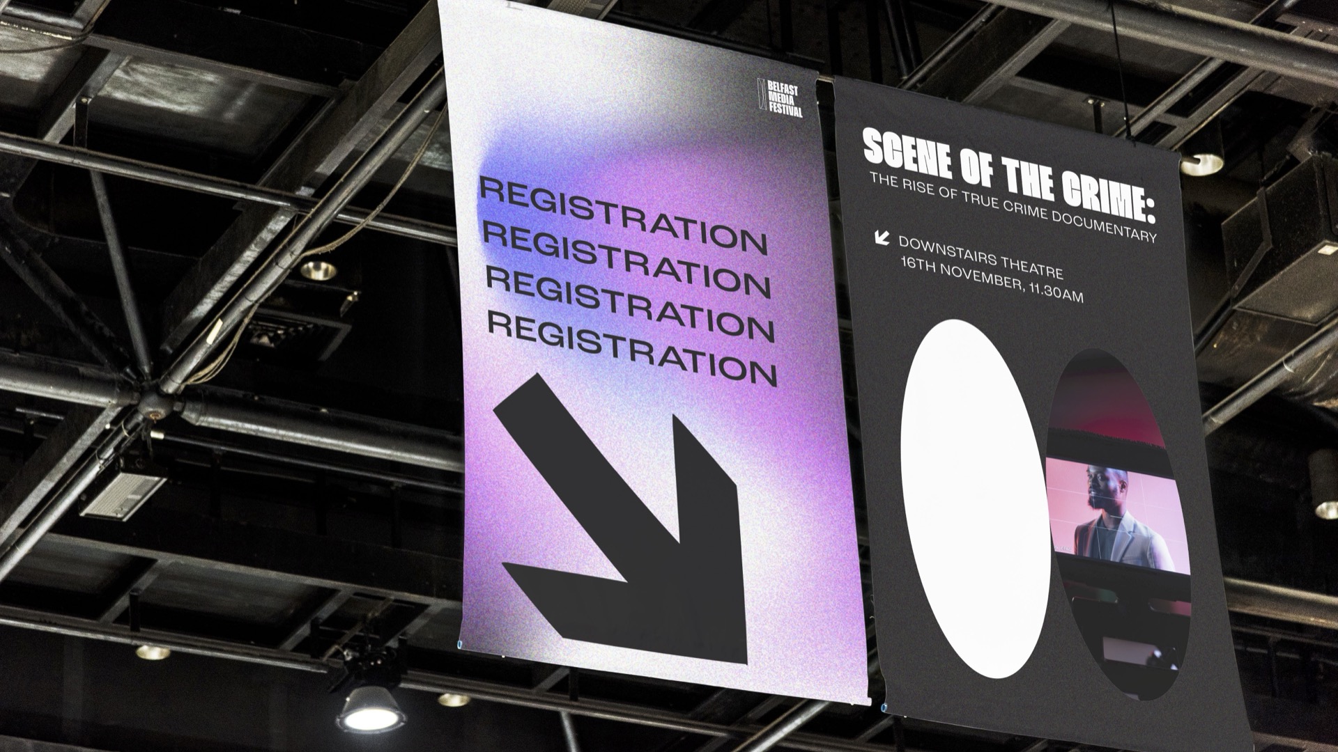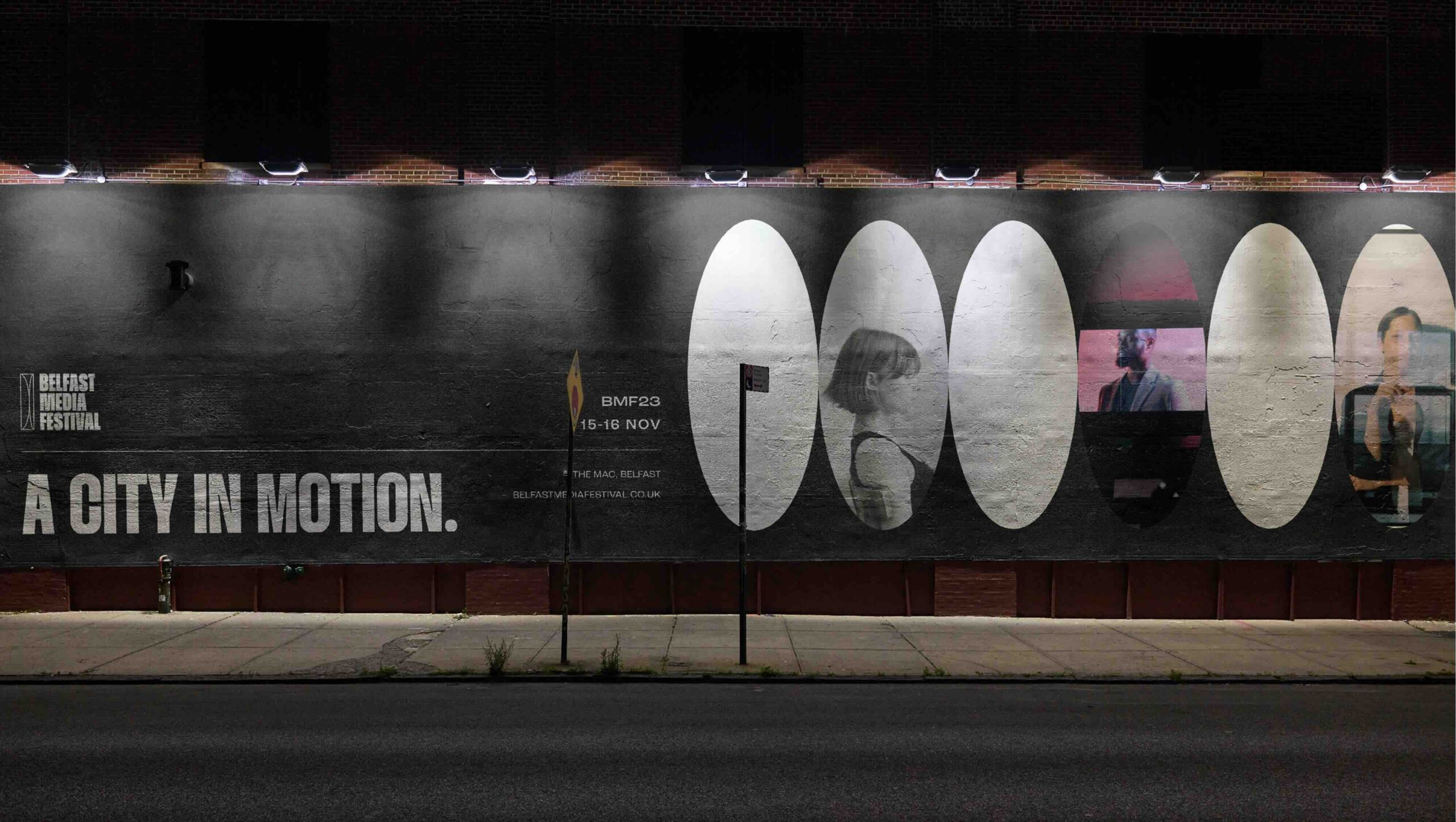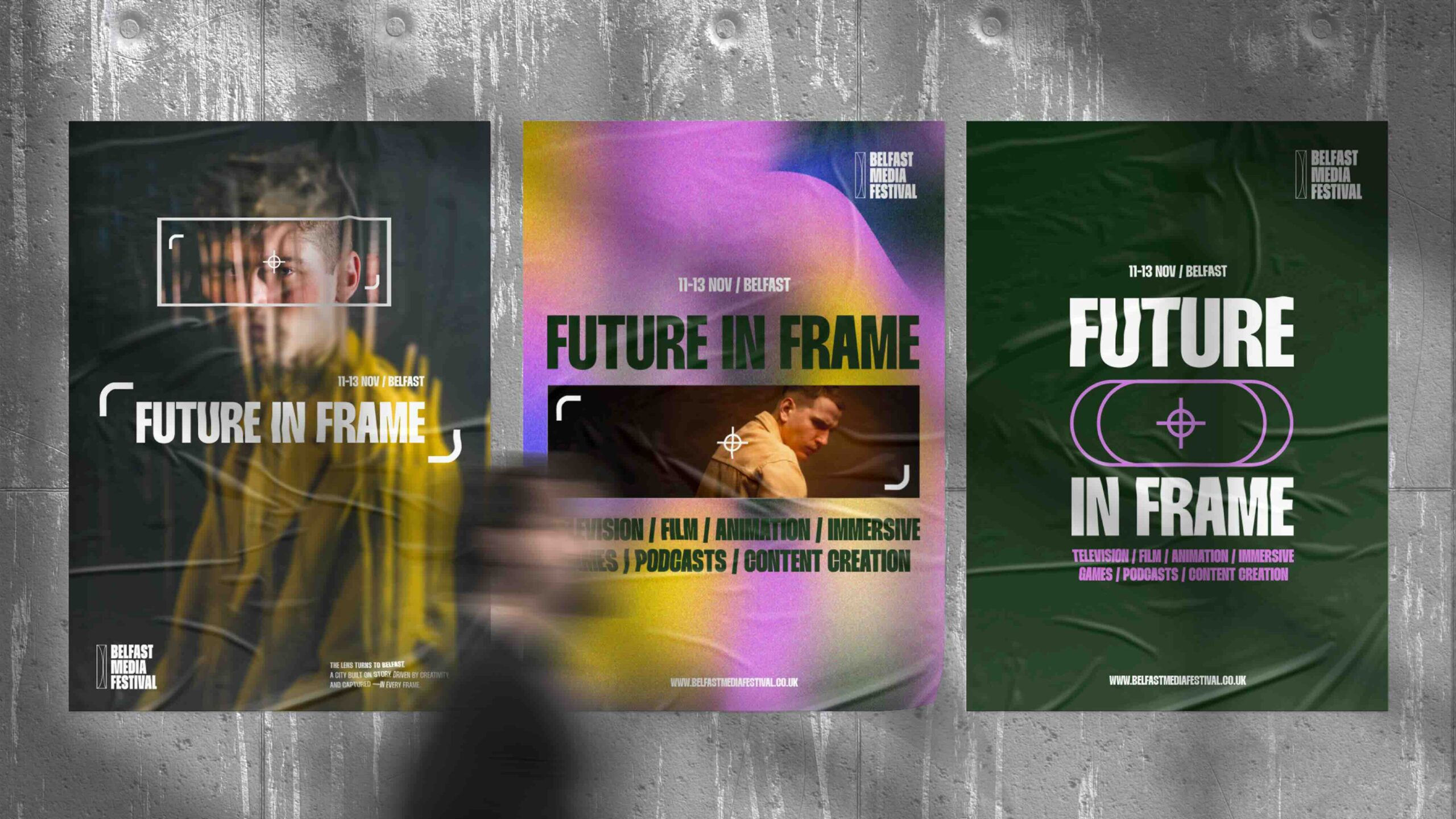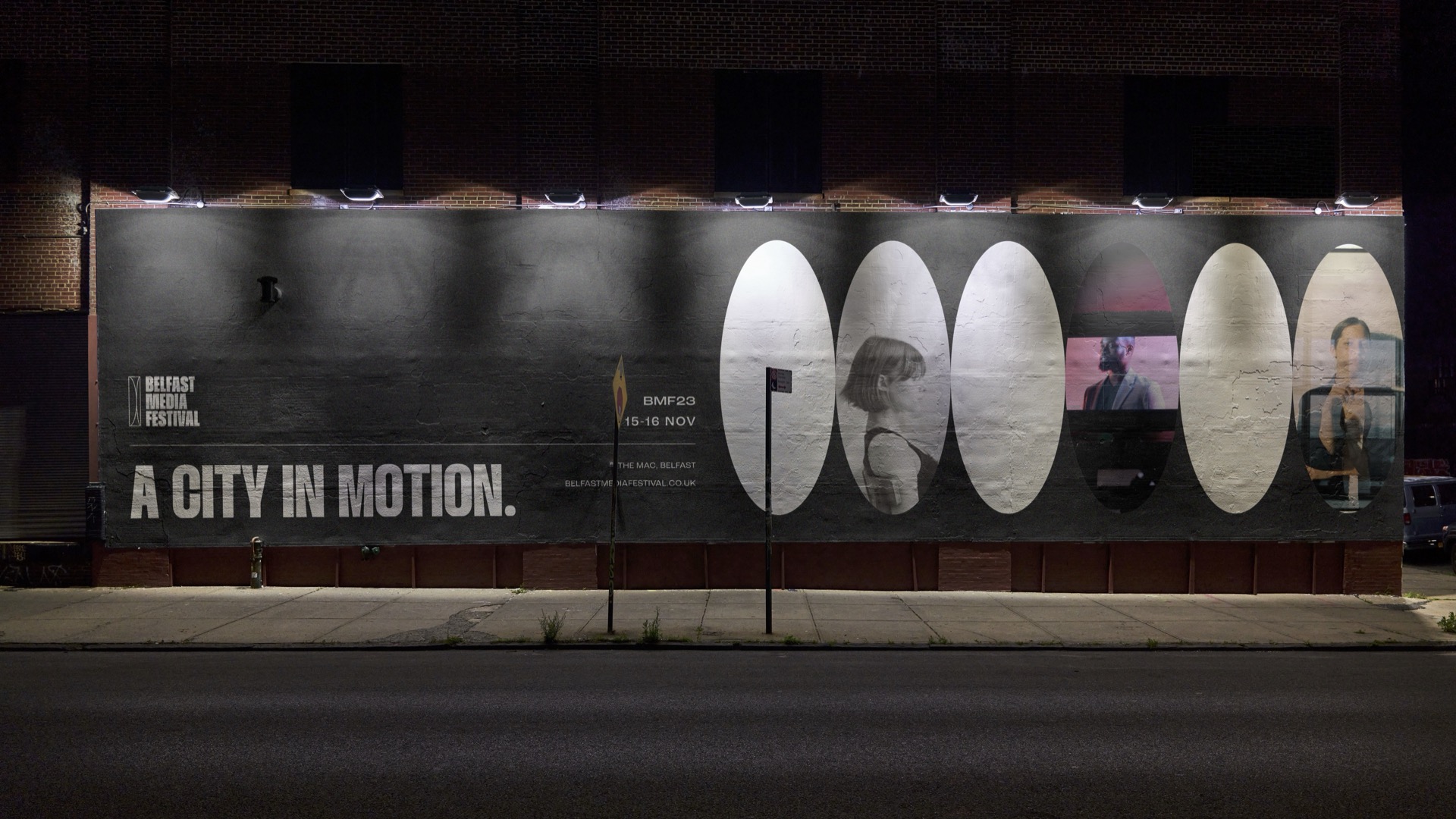 We devised a new, contemporary brand identity for the festival. This rebranding aimed to align the festival with its vibrant and youthful target audience. The brand was designed to be professional yet creative, inclusive, trendy, and fun. A dynamic brand campaign, “City in Motion,” was created to roll out the new brand identity. This campaign was implemented across various mediums, including merchandise, flyers, banners, and wayfinding, ensuring a cohesive and impactful presence. Visual elements were introduced that tied back to the festival’s core theme, incorporating a camera lens icon to symbolise the diverse media types represented at the Belfast Media Festival, including TV, film, gaming, and more. Gradient textures and fluid lines conveyed the dynamic nature of media, voices, and perspectives.The colour palette, built using RGB colours, prominently featured pink to appeal to a youthful audience.