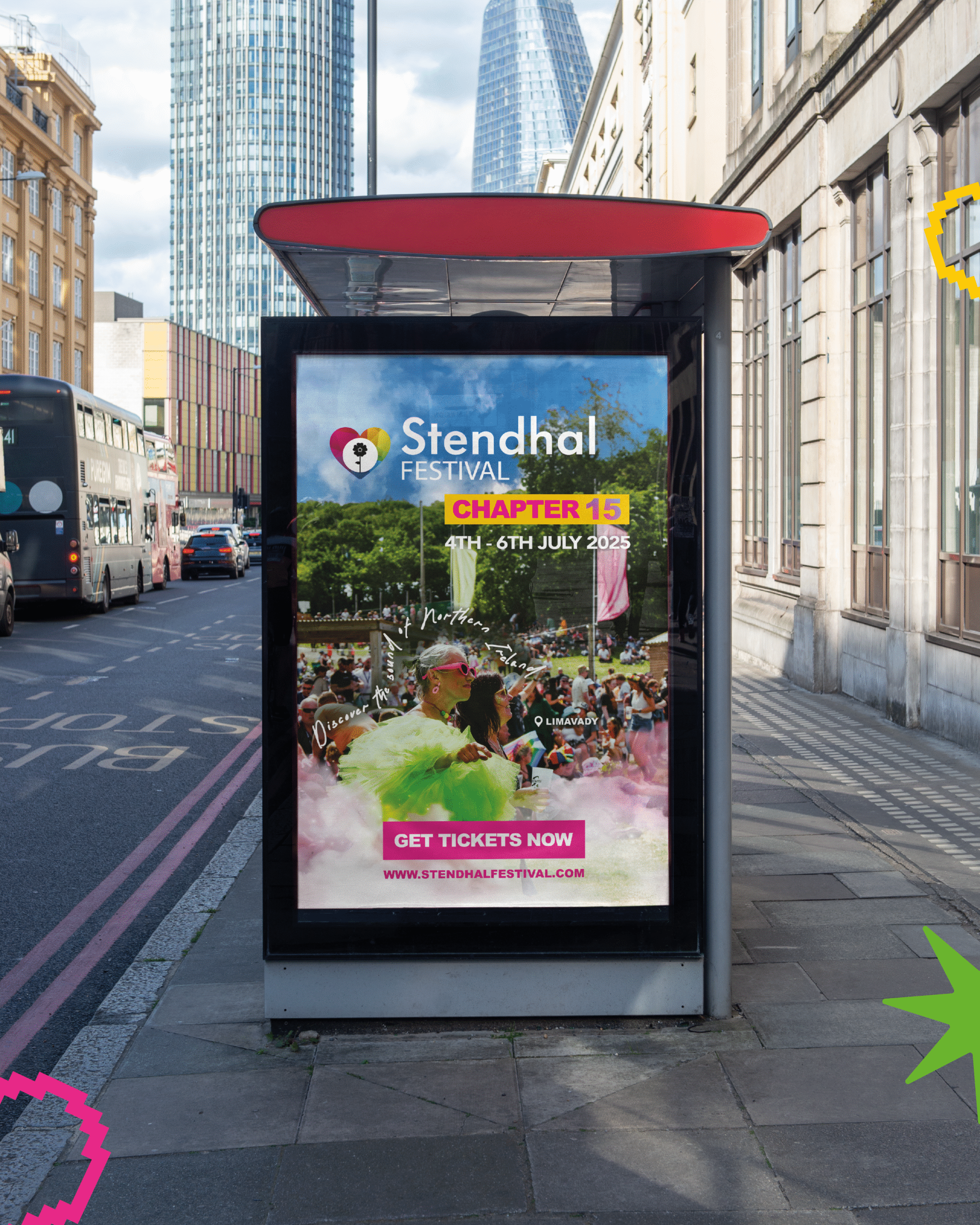 The visual identity for Chapter 15 was built around the spirit of Stendhal Festival – bright, bold, joyful, and rooted in discovery, and of its own, magical land. Inspired by Stendhal Syndrome and the overwhelming rush of creativity it describes, we used vivid colours, playful iconography, and spark-like motifs to capture the wonder, joy, and sense of exploration that define the festival experience.