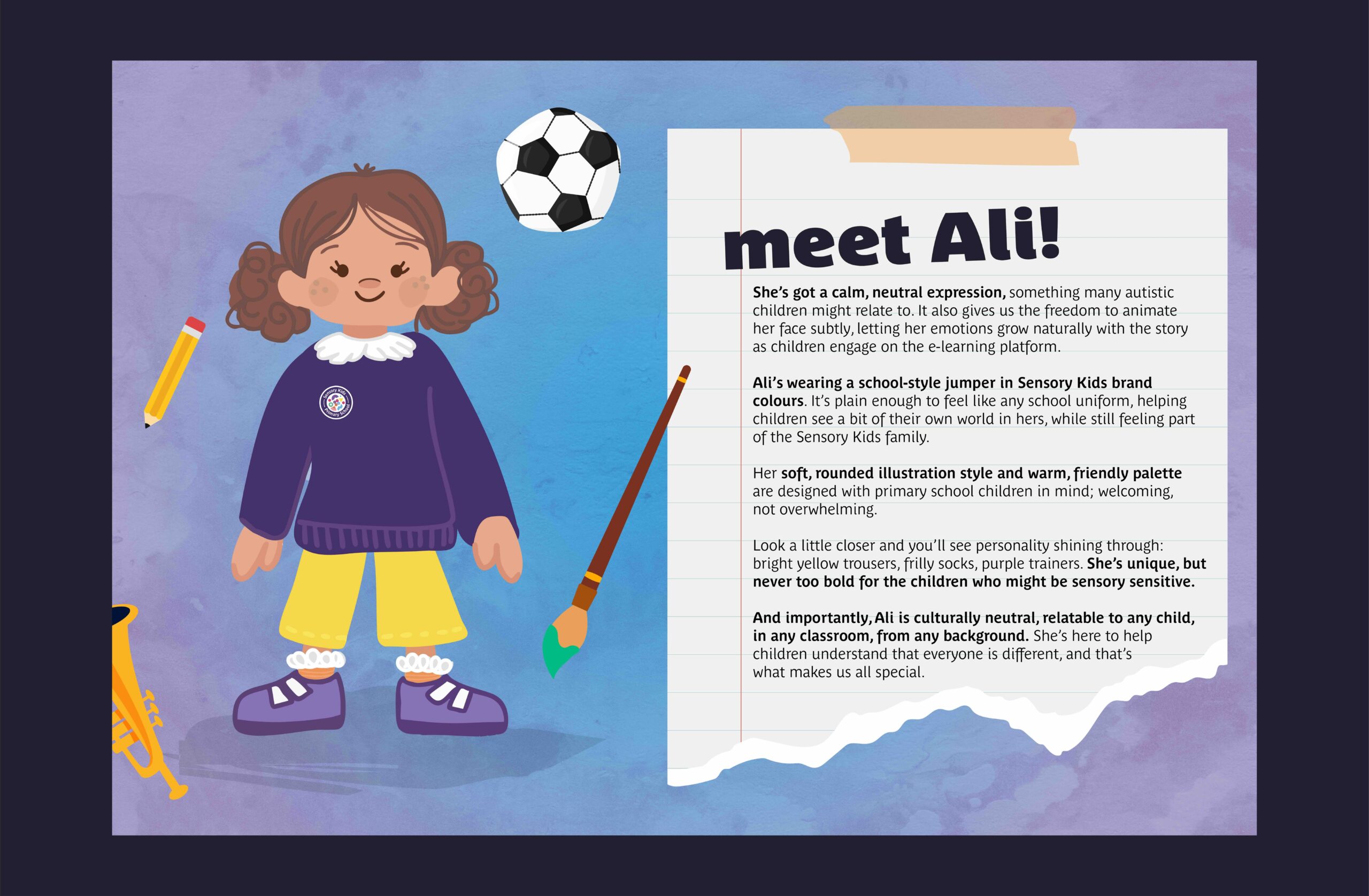 Ali was carefully designed through research into how autistic children should be visually respresented, with neutral facial expressions to allow for subtle animation, a Sensory Kids school uniform and a simple, culturally neutral appearance to ensure Ali feels like she belongs in every classroom.